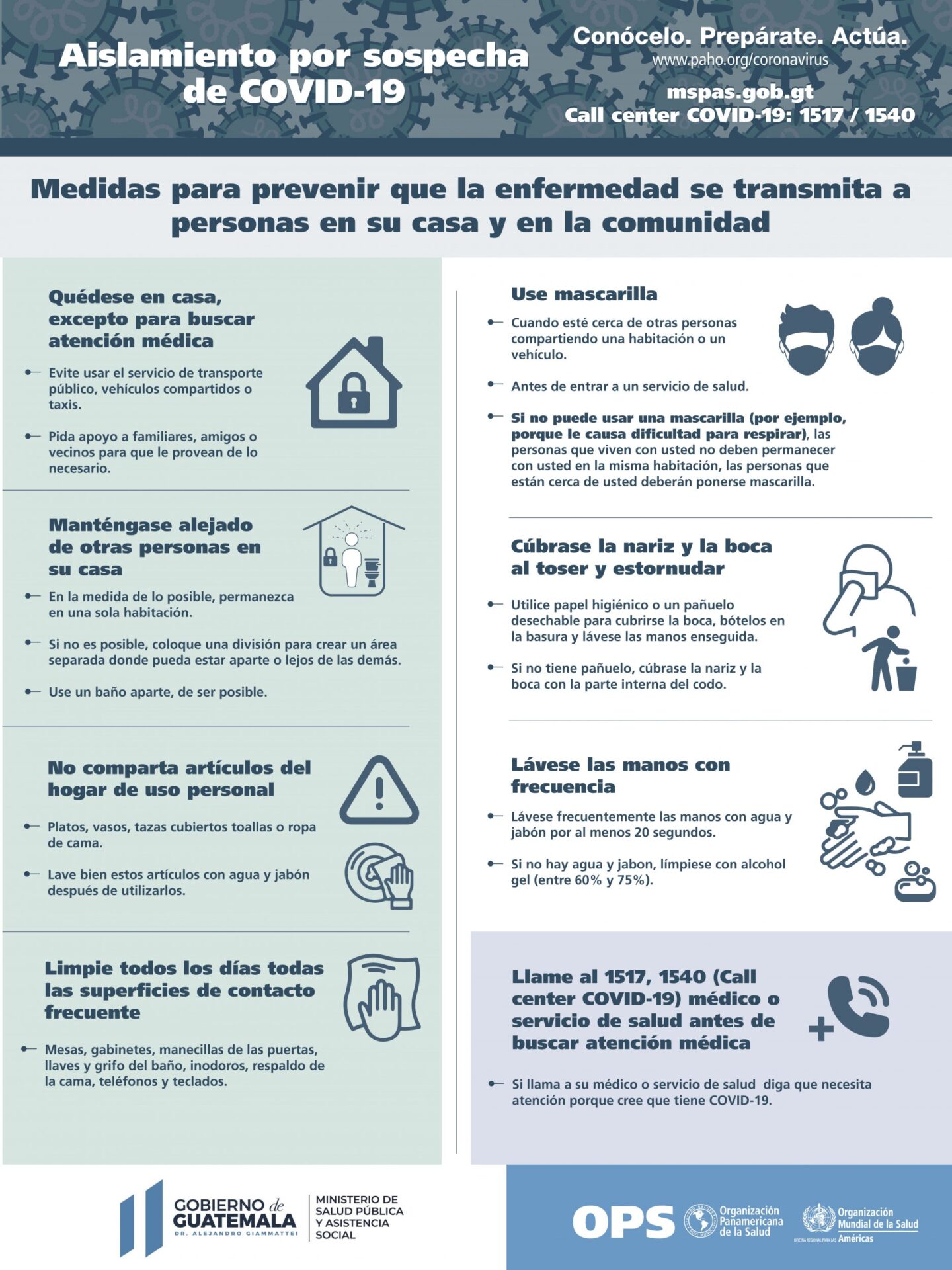 La enfermedad producida por el SARS-Cov-2 se denomina Covid-19 y es una prioridad de salud para la Organización Mundial de la Salud, quien coordina esfuerzos con la Organización Panamericana de la Salud y con el Ministerio de Salud Pública de Guatemala. Existe un Call Center del MSPAS para que puedas consultar sobre casos de Covid-19 o información relativa al tema. Los números son: 1517 o 1540. Puedes descargar los afiches de los lados para conocer sobre la cuarentena o el aislamiento por sospecha de Covid-19.